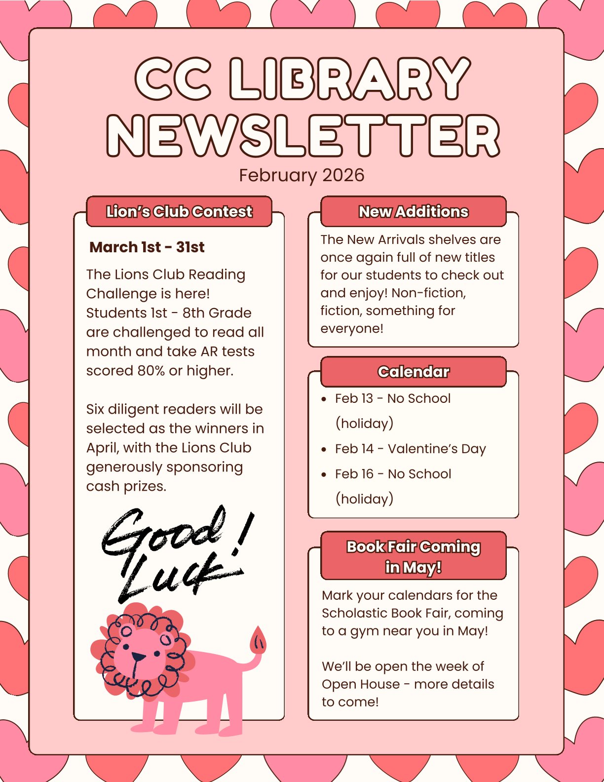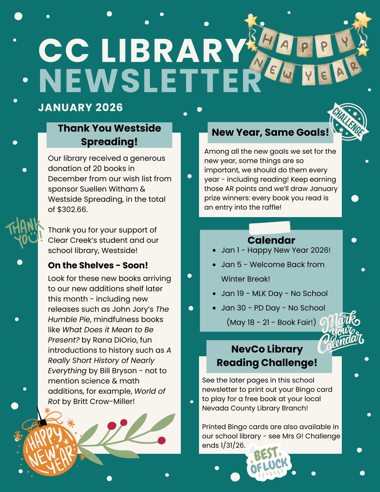 Wishlist – we’ve created an ongoing Library Wishlist on Amazon for books that would be great additions to the current collection. We kindly prefer hardcover and library editions so the books will have long lifespans on the shelves, if possible. Link Coming Soon!